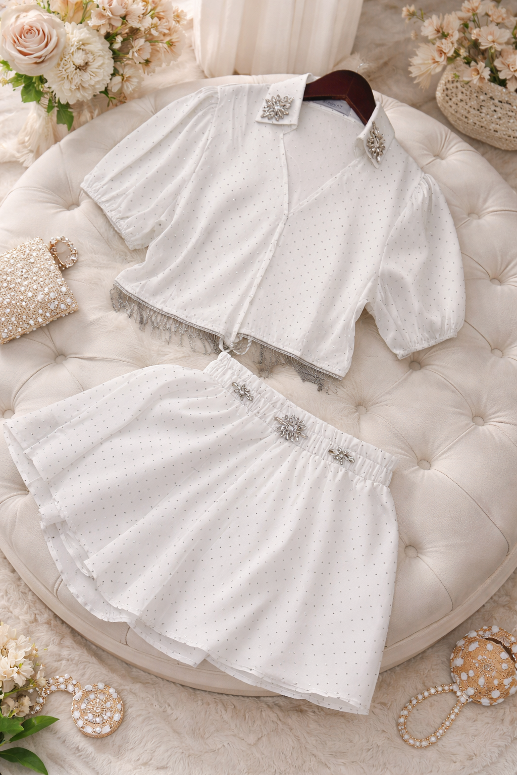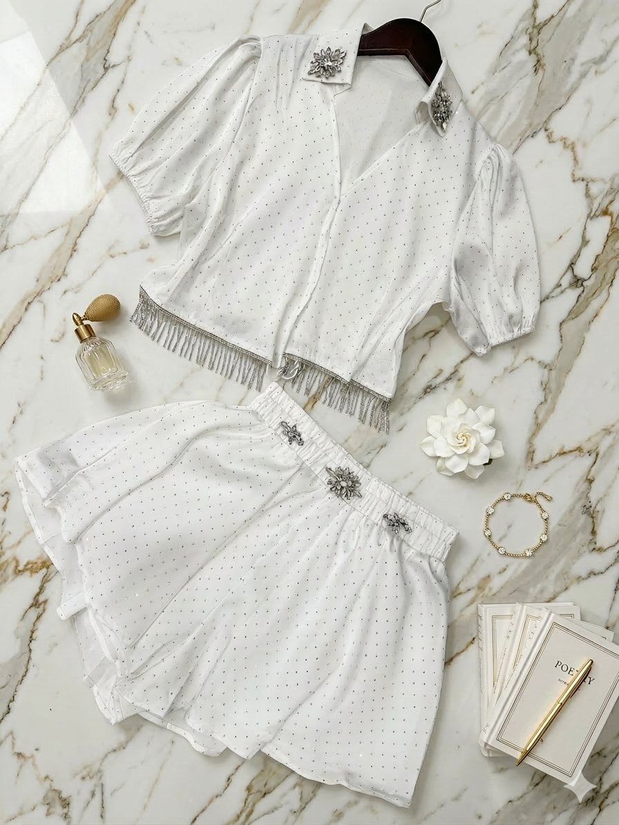 The Alicia Embellished Skort Set is designed for spring and summer, ideal for vacations in sunny environments. Its embellishments provide a touch of elegance, while the skort construction offers comfort and versatility, accommodating various activities and ensuring ease of movement. This set is both functional and stylish for warm-weather outings.