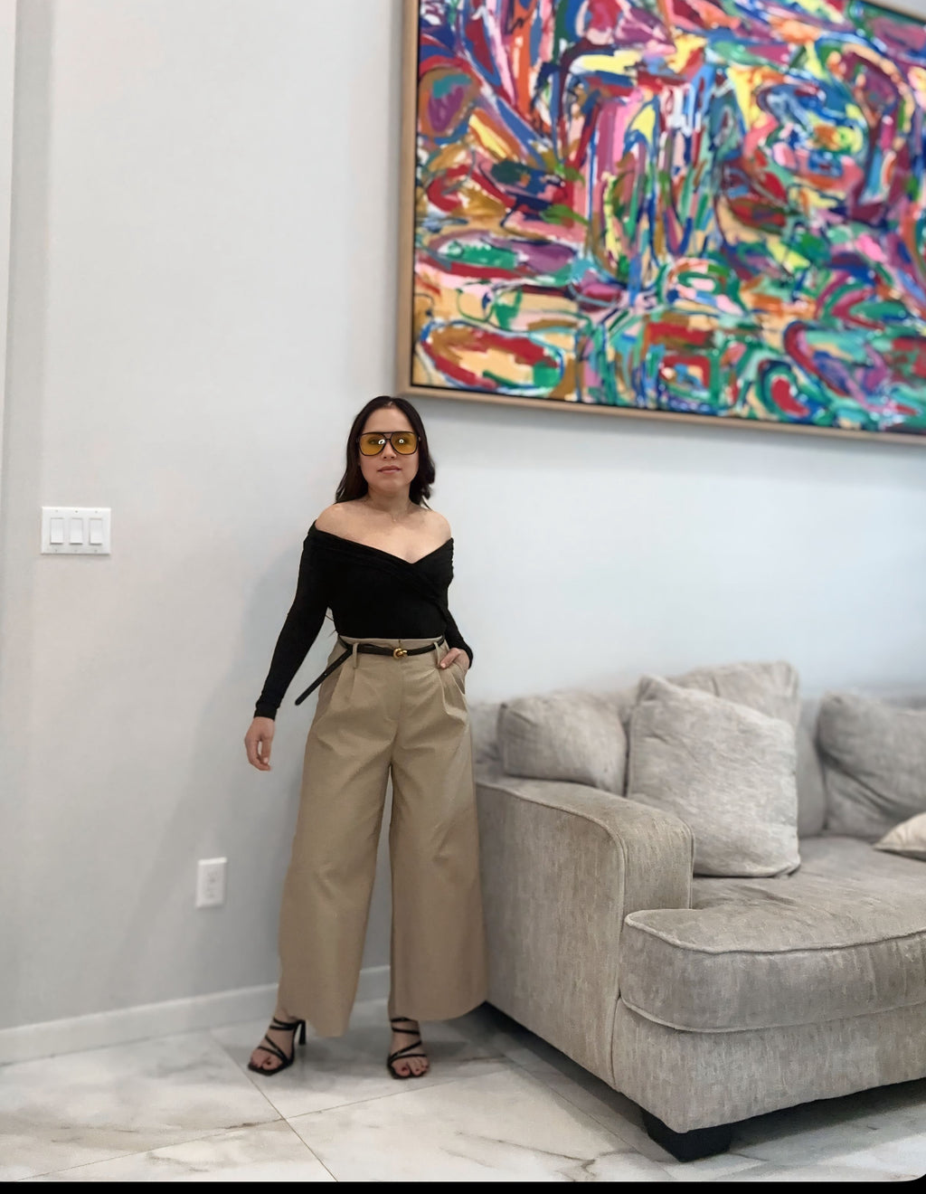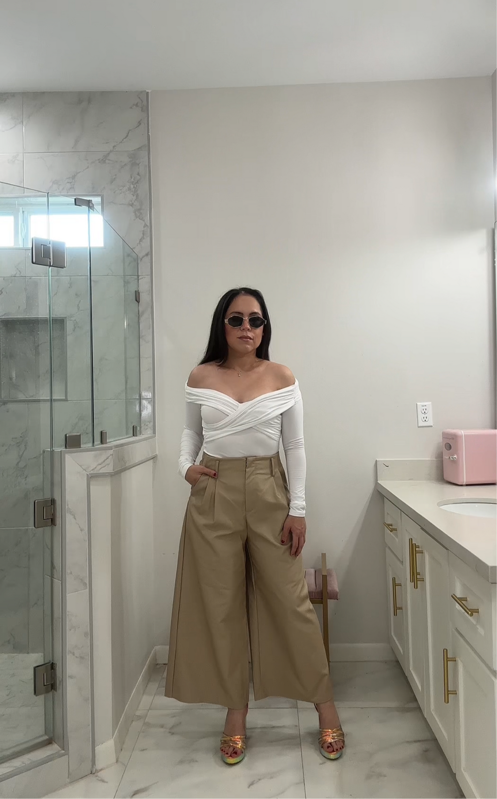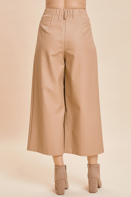 "Enhance your style with our Shout culotte pants. Made of premium faux leather, these wide-leg pants offer a chic and sophisticated look. The culotte style provides a modern touch, while the nude color adds a subtle elegance. Perfect for any occasion!"