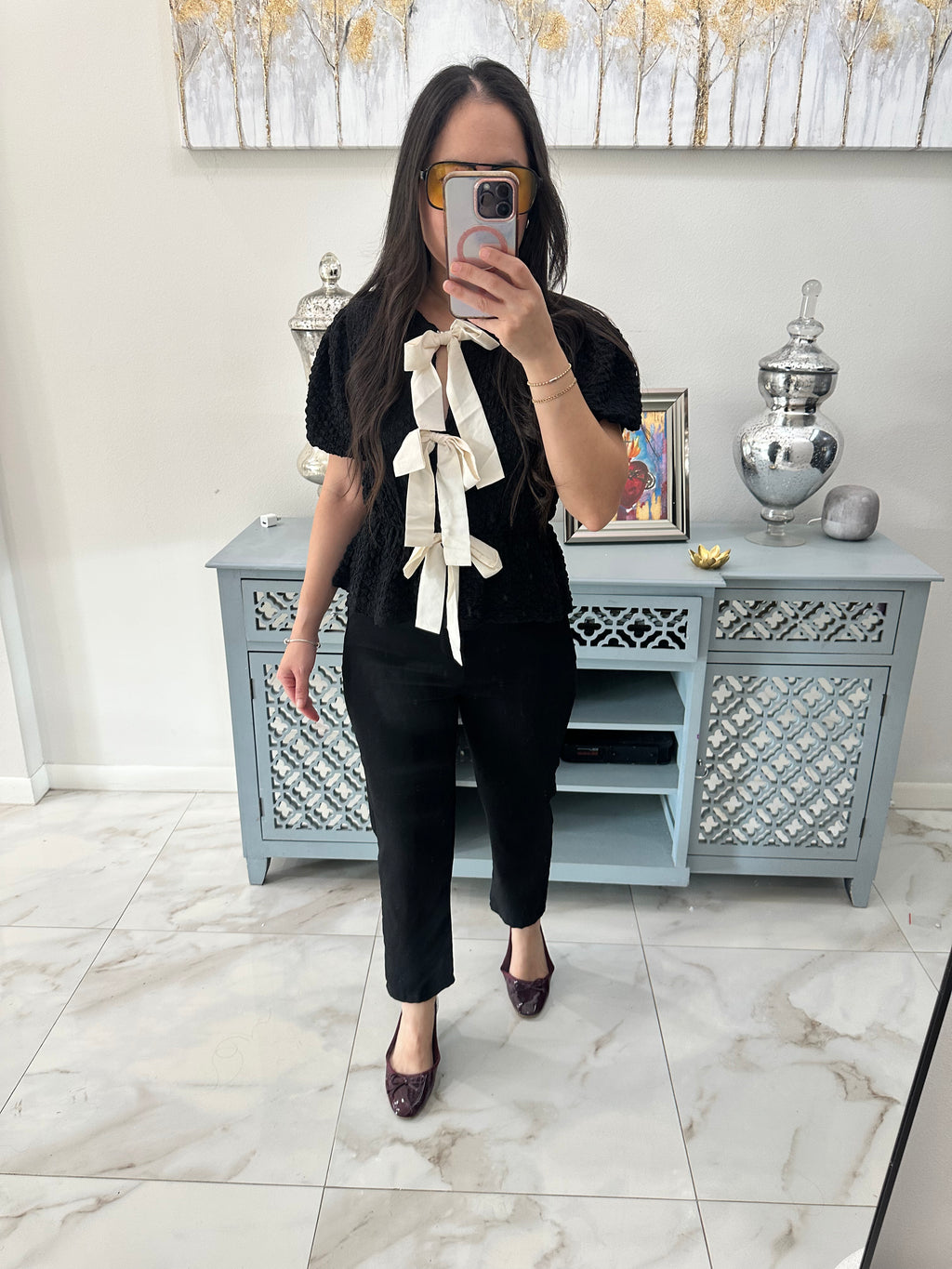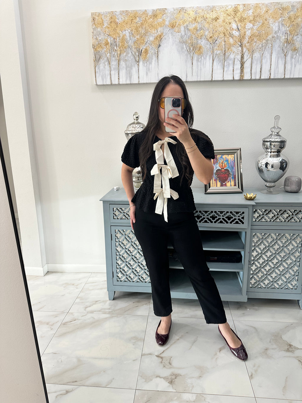 This stylish blouse from Bow Affaire features a flattering peplum design and charming bow accents. Its cute and sophisticated look is perfect for any occasion. Elevate your wardrobe with this must-have piece.