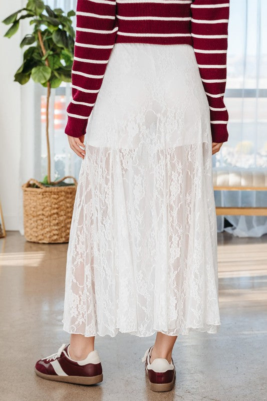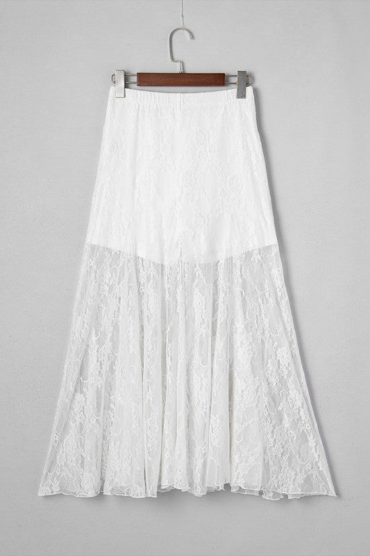 Twirl into romance with this stunning maxi skirt that's equal parts dreamy and effortless. Delicate floral lace creates an enchanting sheer overlay, while the flowing silhouette dances gracefully with your every move. Perfect for warm-weather adventures, the lightweight fabric keeps you cool and comfortable without sacrificing that undeniable elegance. Whether you're heading to a garden party or a sunset stroll, this skirt brings an airy, feminine charm that feels both timeless and playfully modern. Poly/Spandex